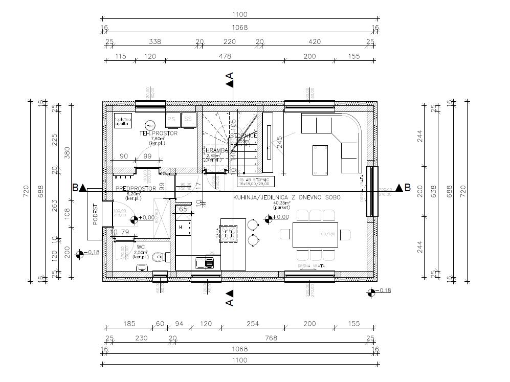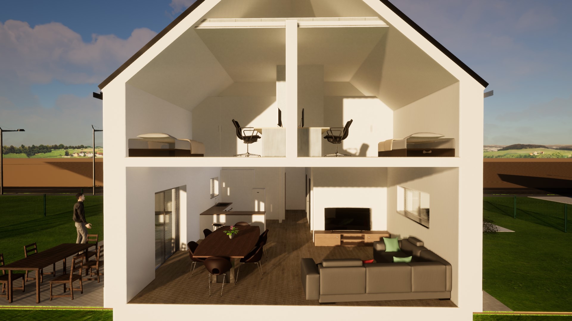 PROSTORI: Hiše so etažnosti P+M. V pritlični etaži so: predprostor, tehnični prostor s pralnico, shramba, bivalni prostor s kuhinjo, jedilnico in dnevno sobo z izhodom na zunanjo teraso. V mansardi so: hodnik, spalnica z garderobno sobo, dve otroški sobi in kopalnica.